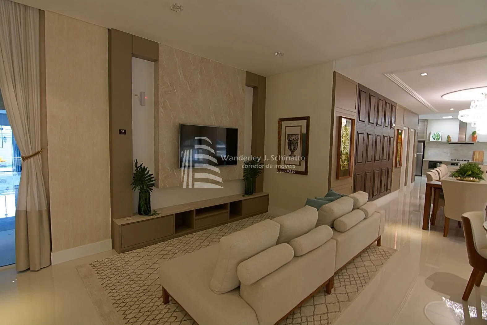 - Teto com Detalhes em Gesso e Cortineiros: Um design inteligente que agrega valor estético e funcionalidade, preparando o cenário para sua decoração personalizada.