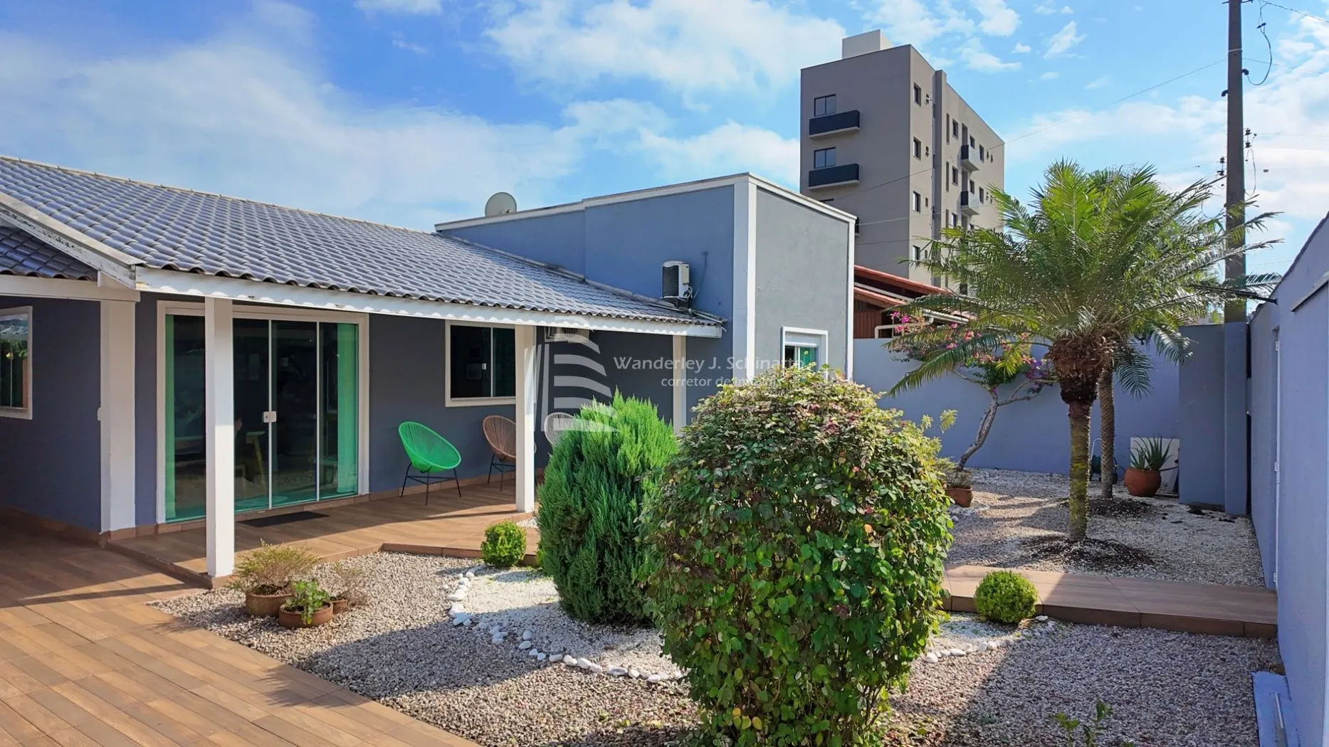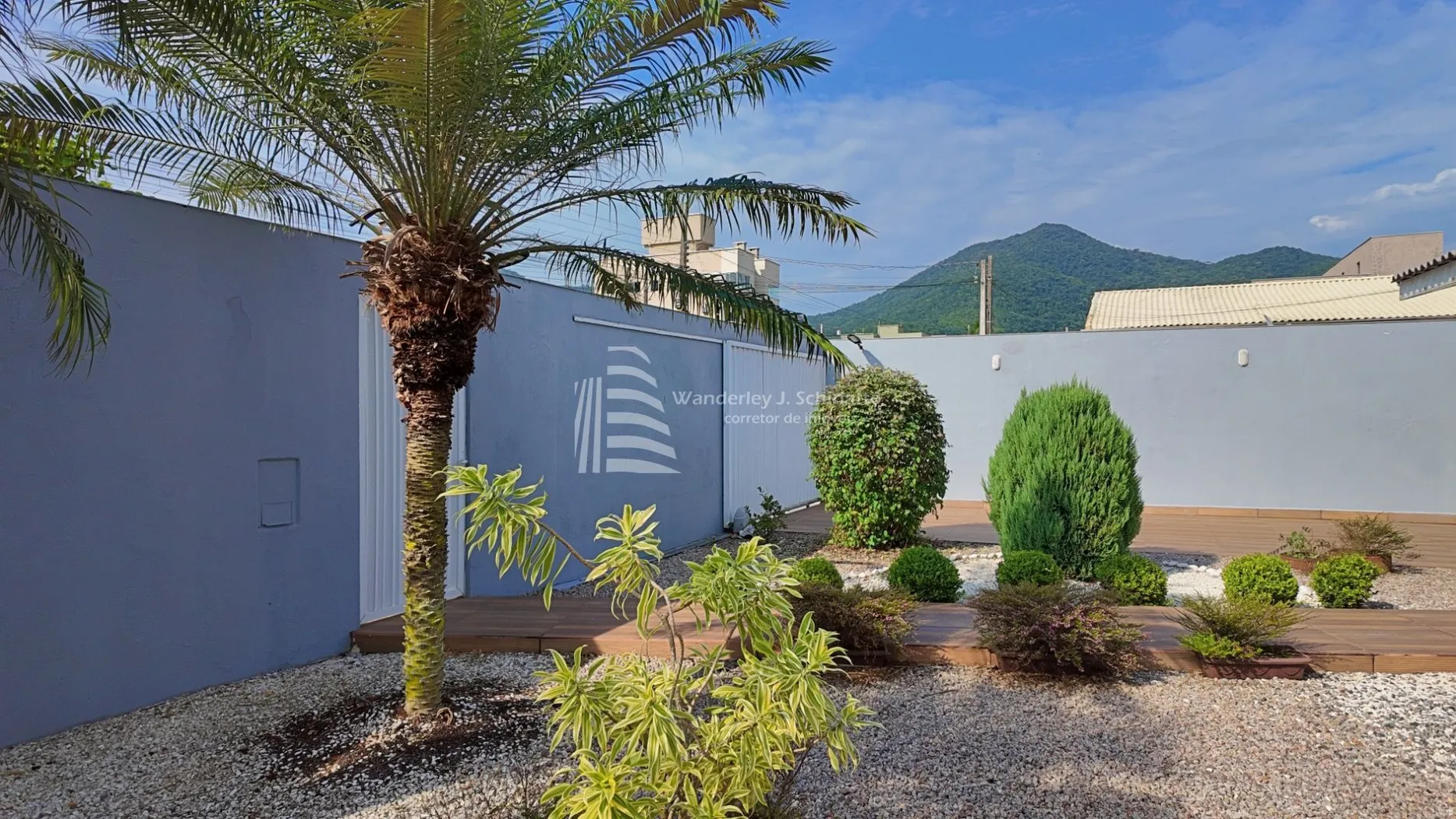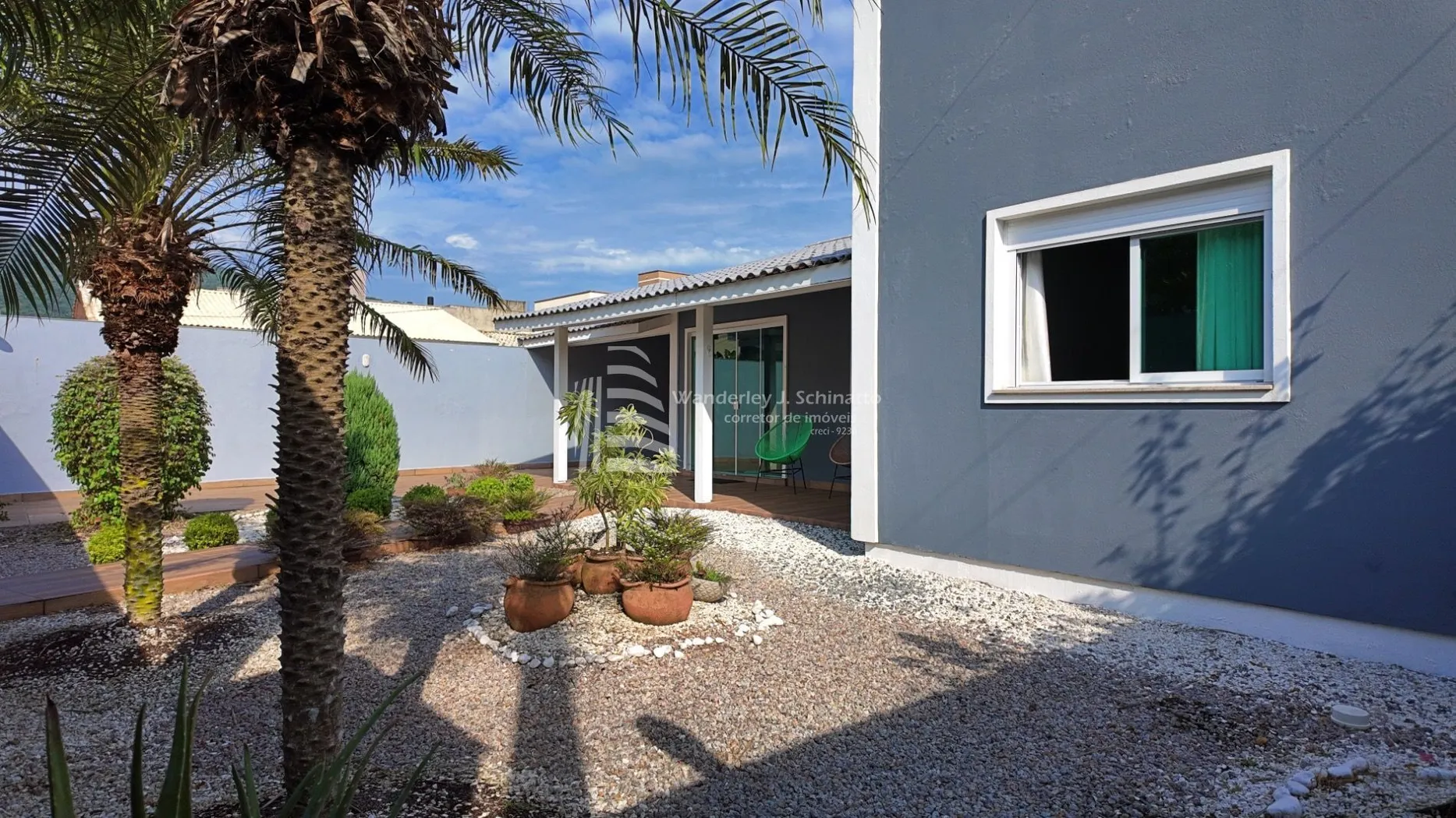 - Um charmoso jardim frontal com palmeiras, trepadeira e canteiros, que emolduram a entrada da casa.