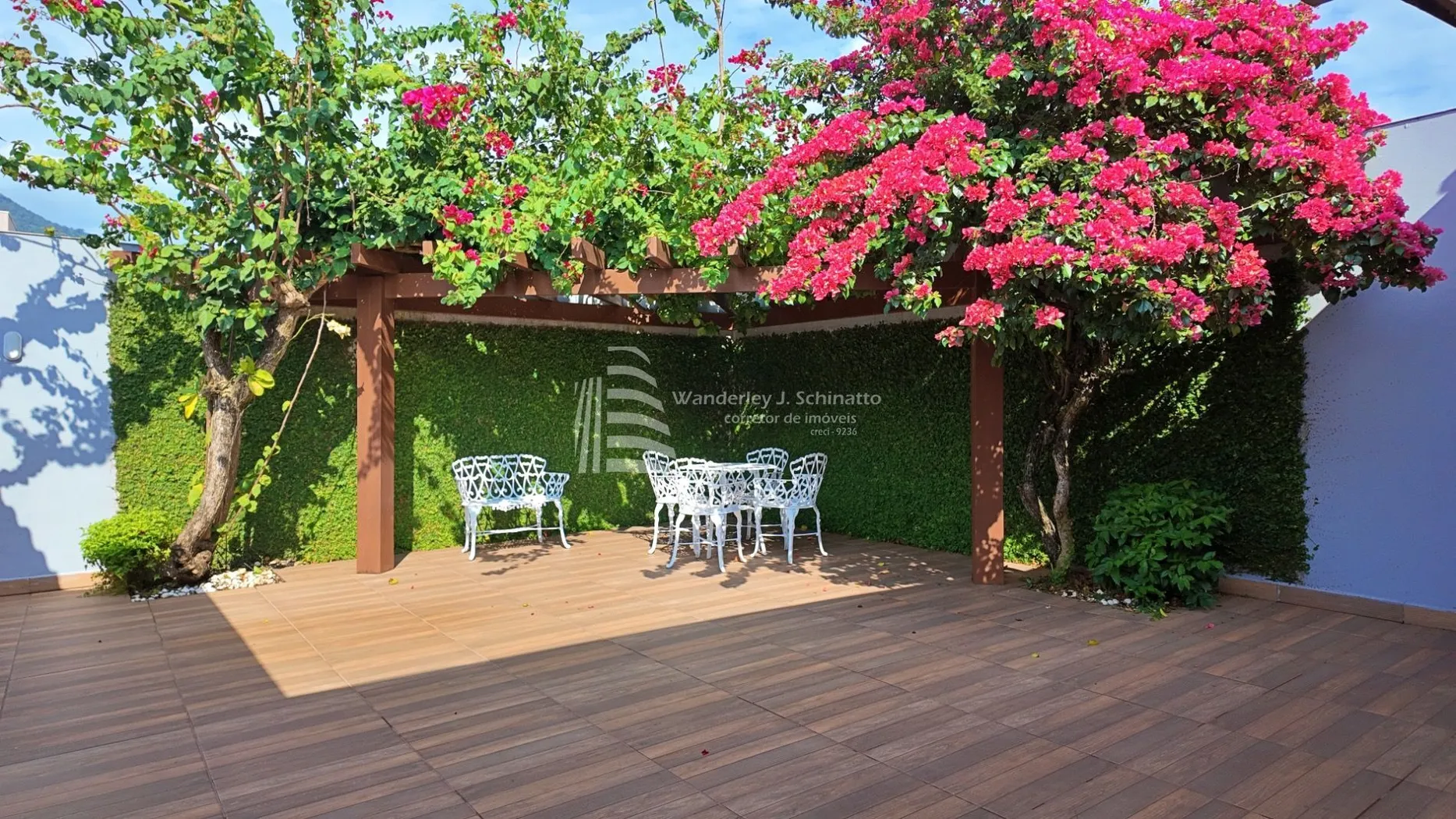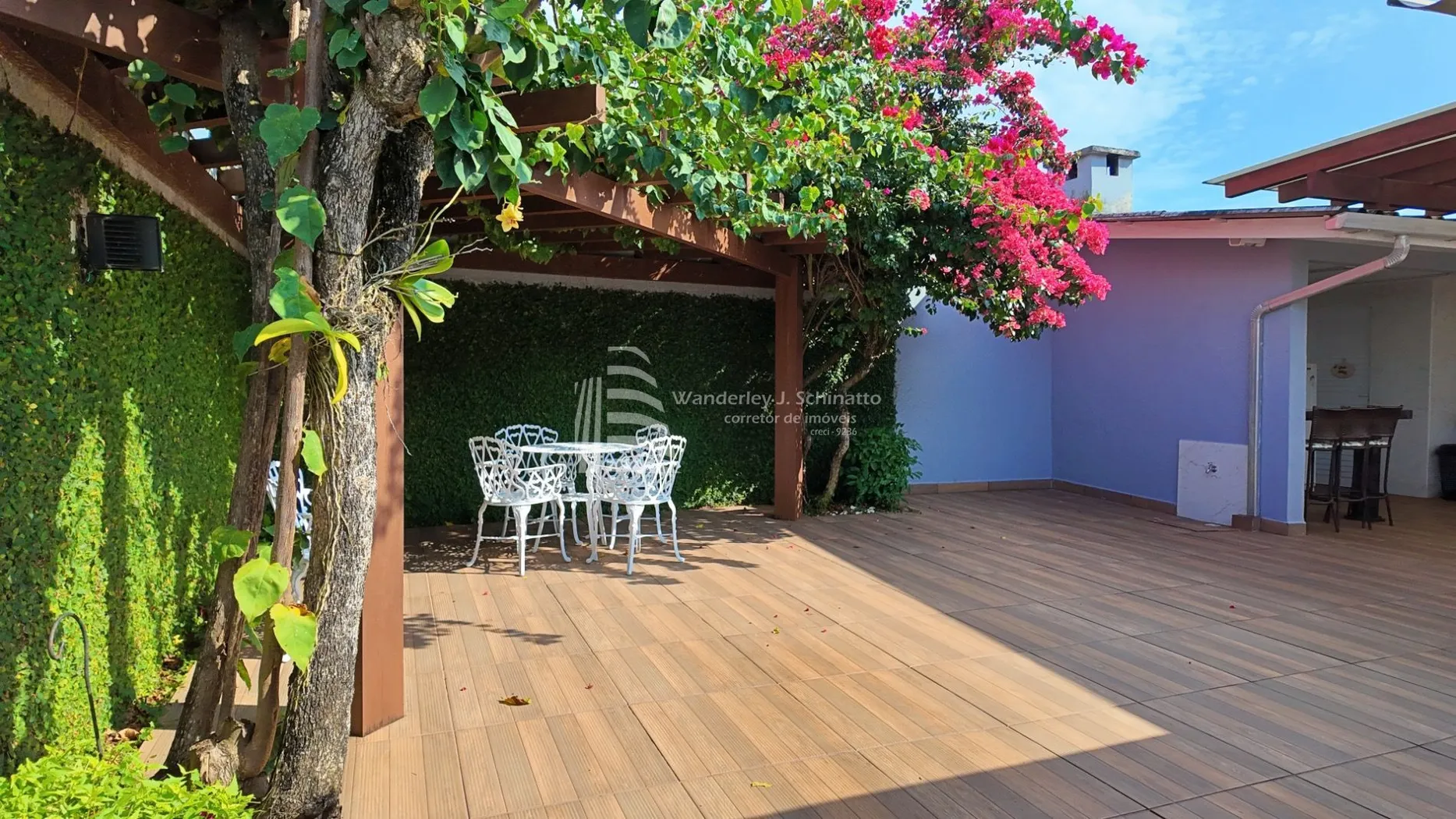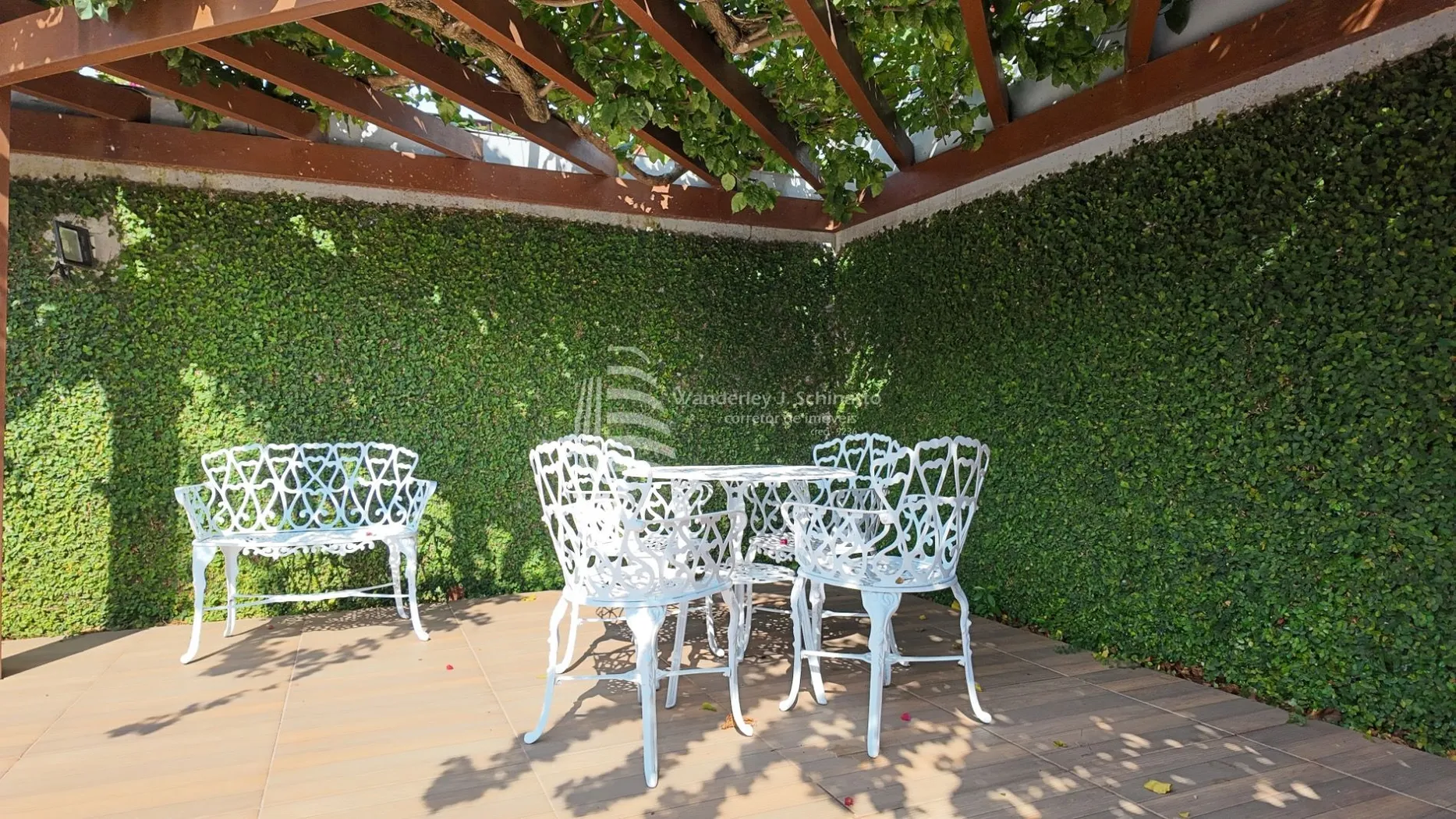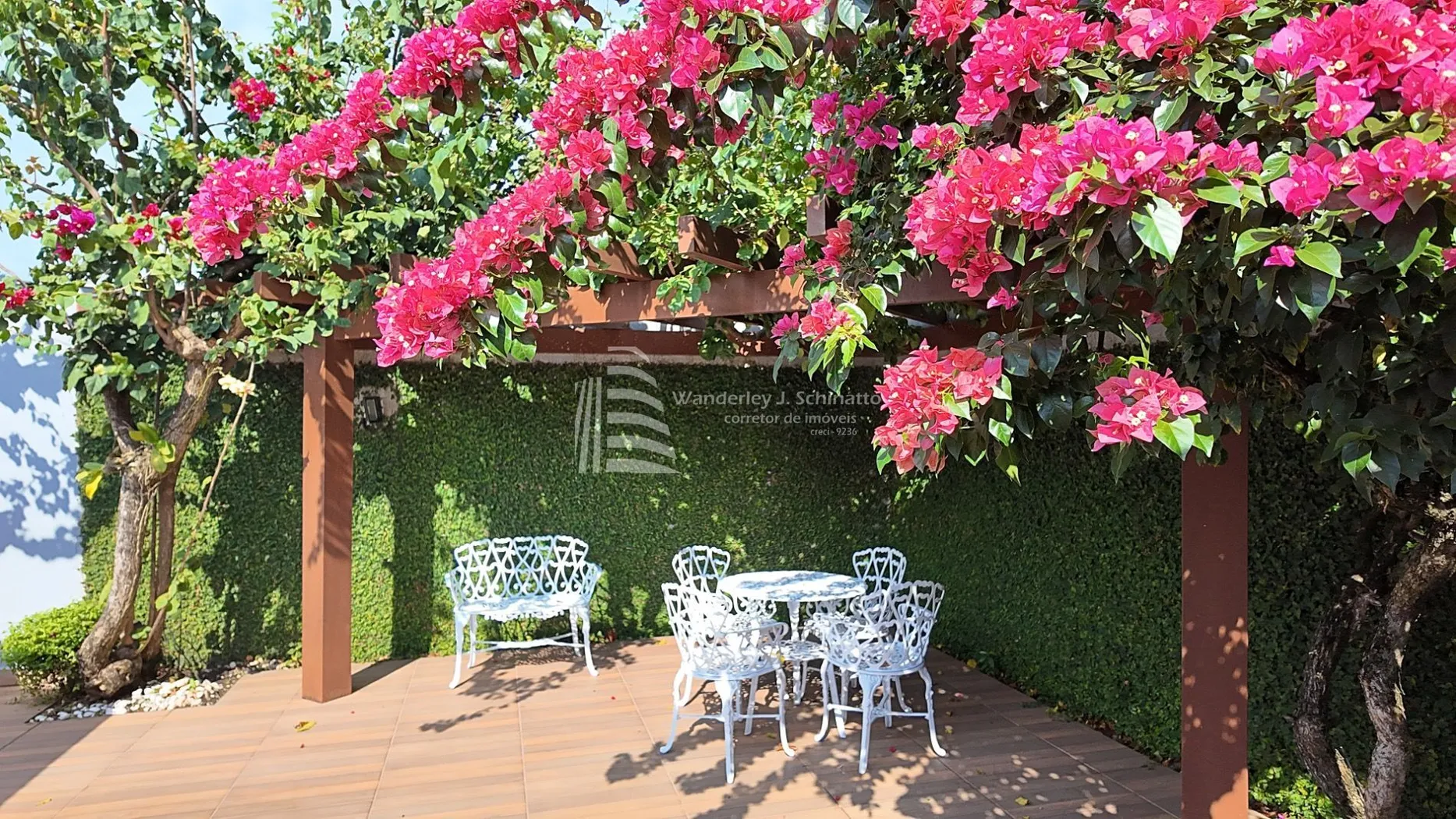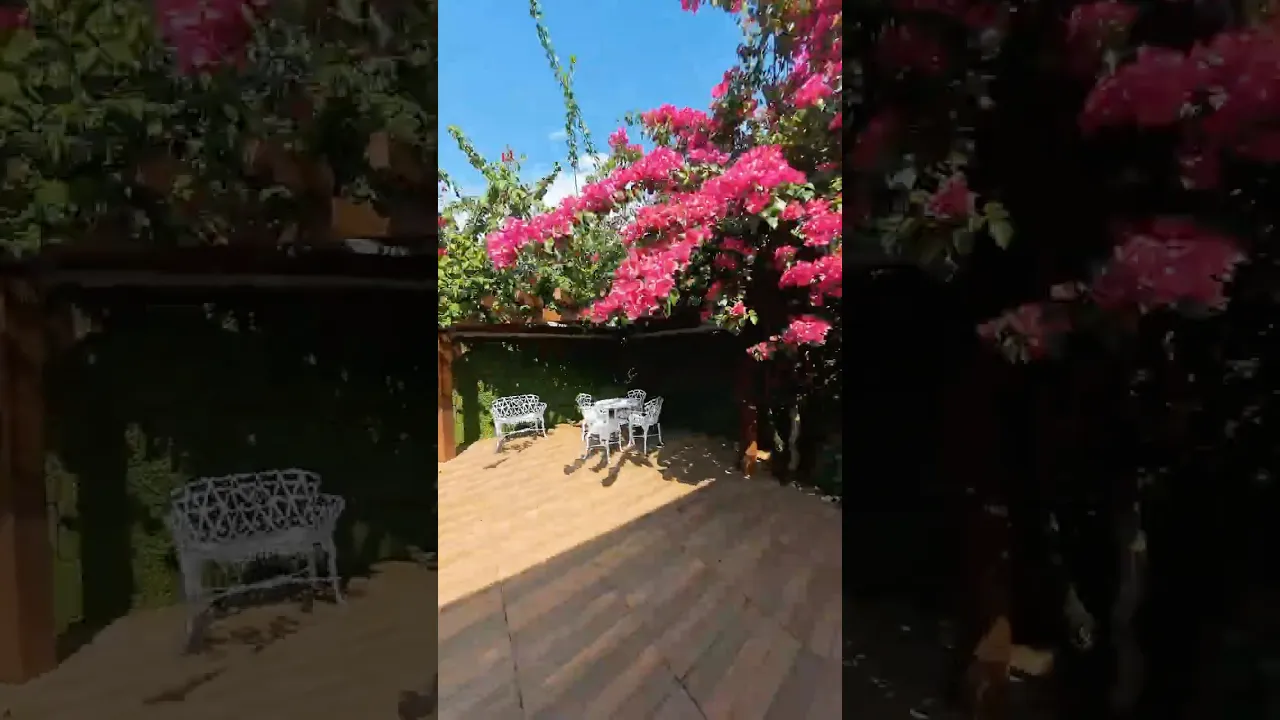 - Um encantador pergolado em madeira com trepadeiras floridas, criando um refúgio de tranquilidade e beleza.