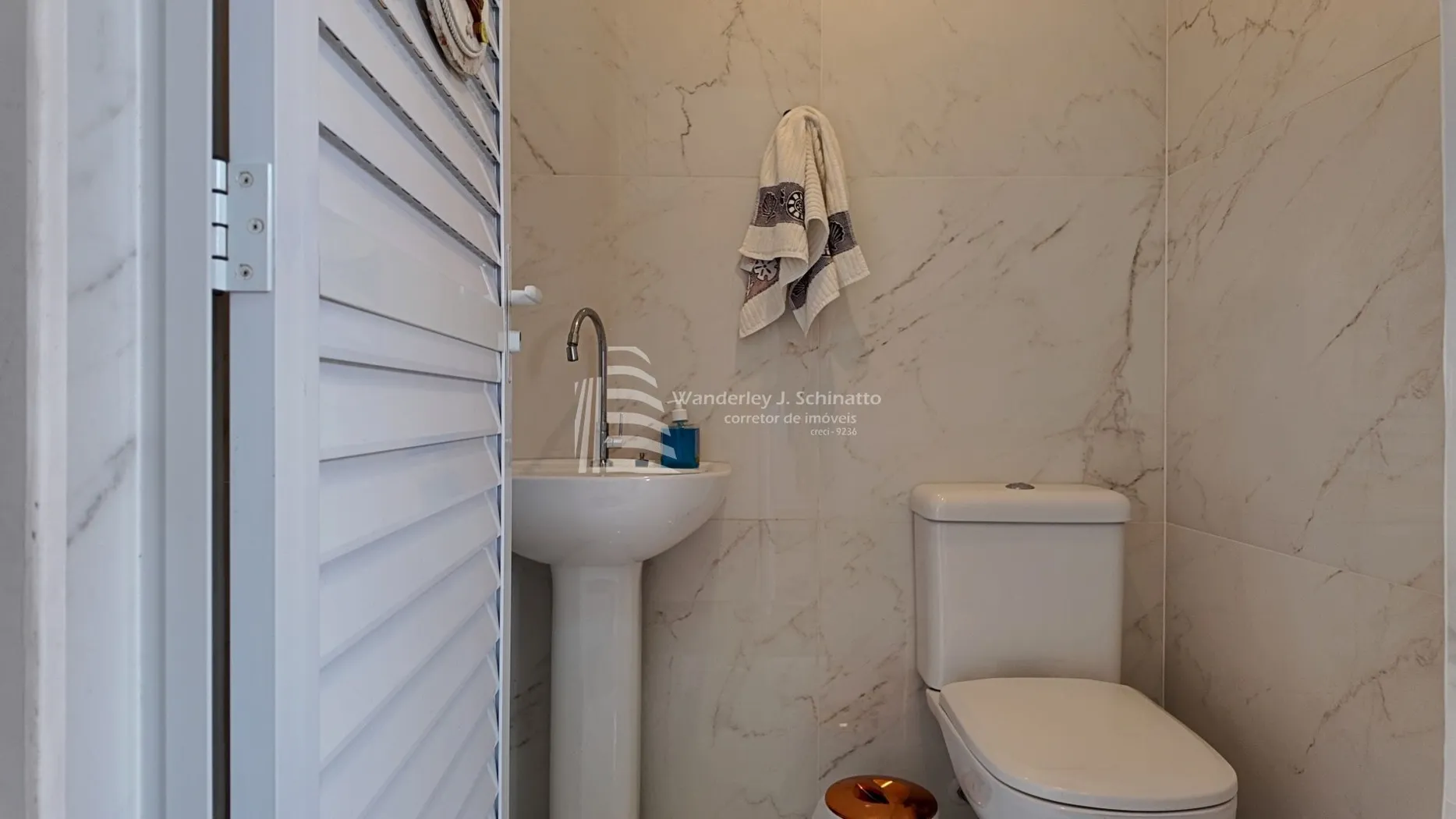 - Piso em porcelanato marmorizado, conferindo um toque moderno, atemporal e facilidade de manutenção.